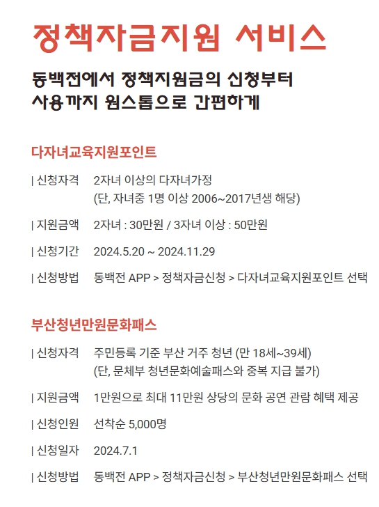 - 다자녀 교육지원포인트: 다자녀 가맹점에서 동백전 카드로 결제(삼성페이 등 간편결제 등록 가능)