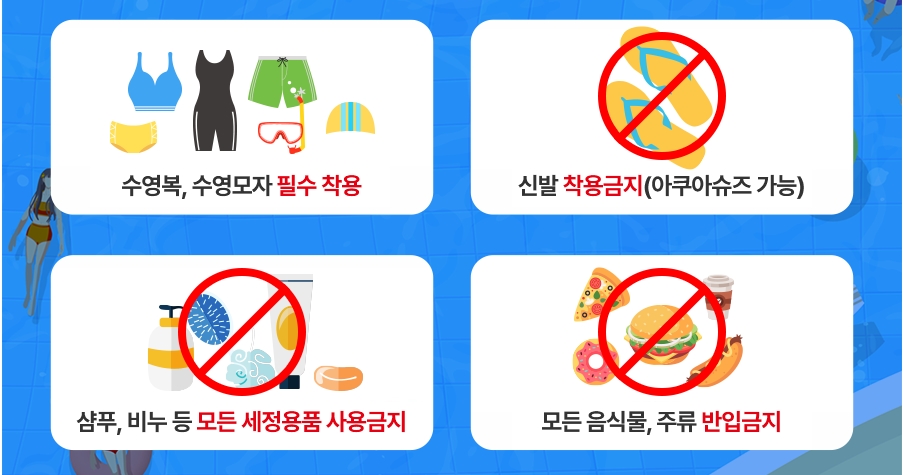 - 필수 준비물: 어린이 수영모/수경(안전 규정), 여벌 옷, 방수팩, 슬리퍼 등