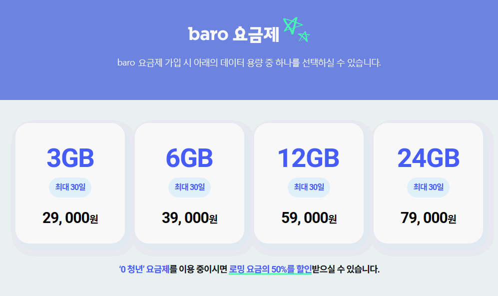 ✔ baro 요금제 전용 혜택 – 데이터 로밍 지원 및 부가 혜택 제공