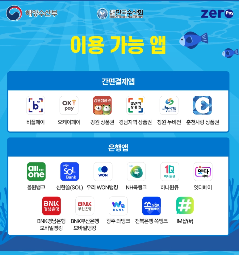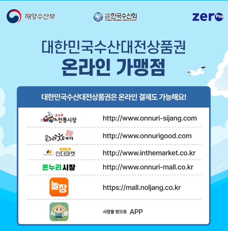 - 오프라인: 전국 수산물 도소매 가맹점(음식점·주류판매점 제외)