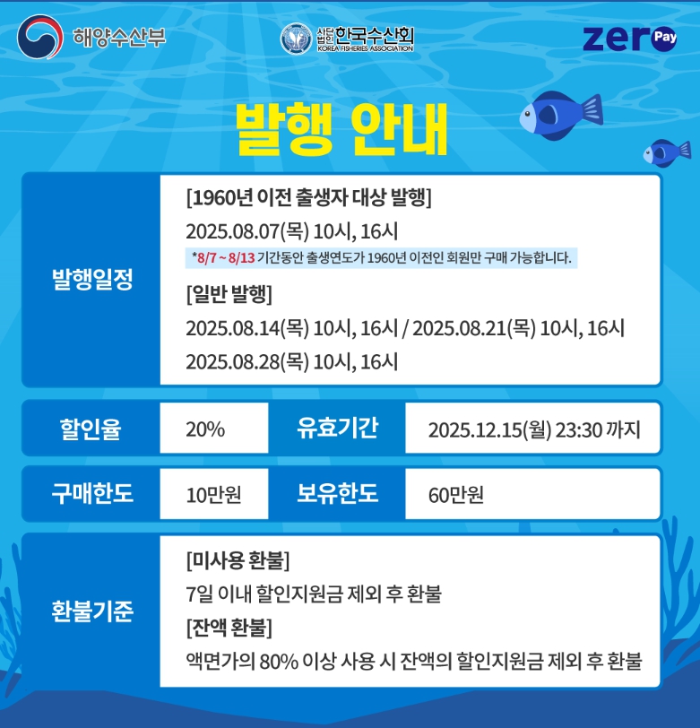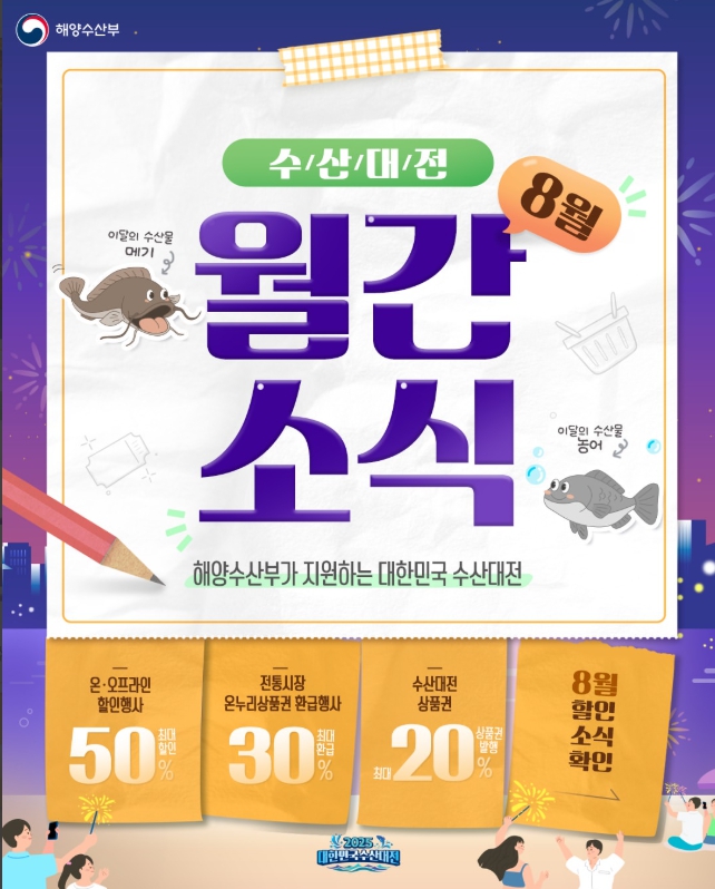 - 수산대전상품권 발급: 8월 7일(시니어), 14/21/28일(전 국민)