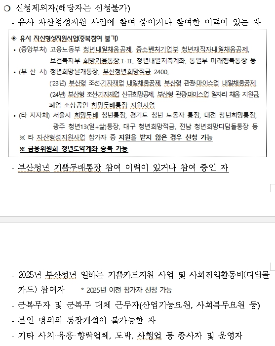 - 제외 대상: 유사 자산형성지원사업(청년내일저축계좌 등) 참여 이력자