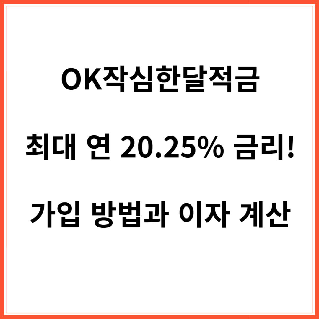 저금리 시대인 요즘 OK저축은행에서 최대 20.25%인 고금리 상품 OK작심한달적금을 출시했습니다. 이번 포스팅에서는 OK작심한달적금의 가입방법, 만기 시 지급이자, 장단점, 가입시 주의사항에 대해 정리해보겠습니다.